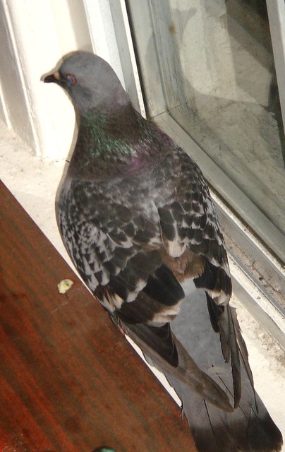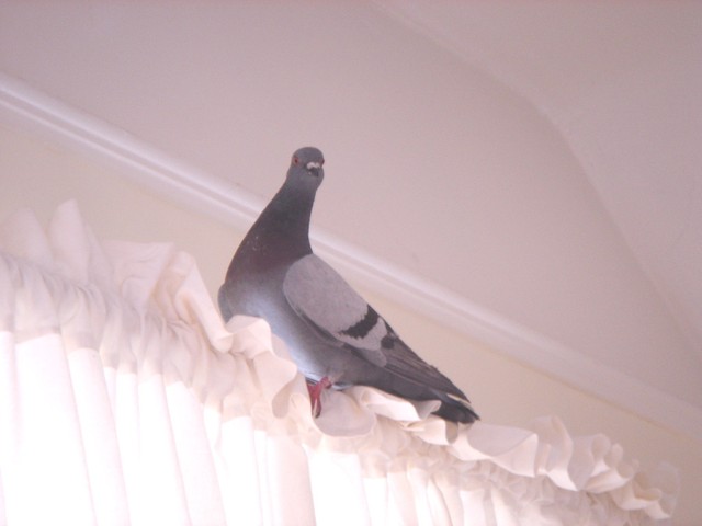 接著把百頁窗慢慢拉起來, 終於鴿子在窗帘上暫時落下腳來