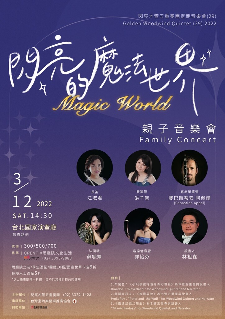 今年,閃亮木管五重奏團將帶來親子節目並以魔法世界為主題,演出布蘭登、普羅高菲夫、電影鐵達尼號等作品,更邀請說書人為這次的音樂會進行講解,相信本場音樂會將帶給聽眾不同於以往的聽覺饗宴。
