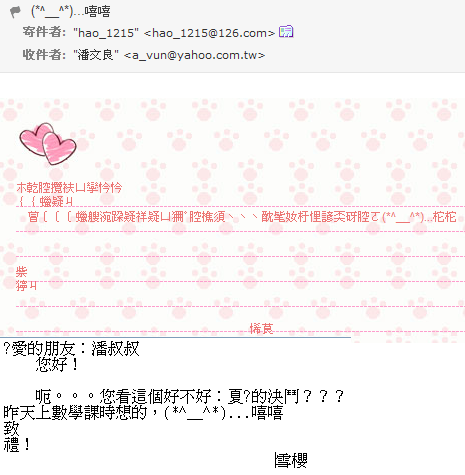 妳的來信,因是簡體字碼,在信箱裡,看到的,是一堆亂碼;轉檔後,有些字,無法正常顯示,就會變成問號(?)。