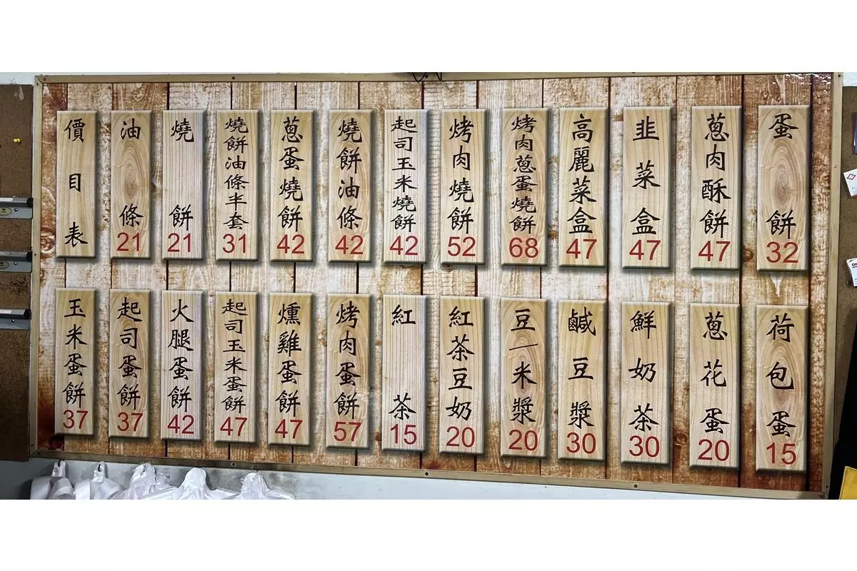 走進店裡,香氣撲鼻的燒餅排列整齊在檯面上,光看就令人食指大動。菜單上的品項多達二十餘種,從傳統燒餅、油條、蛋餅,到創新口味如起司玉米燒餅、燻雞蛋餅等應有盡有。