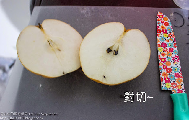 如果事後是用盤子裝盛,可以在水梨底部橫切,有一個平台,讓他站穩^^