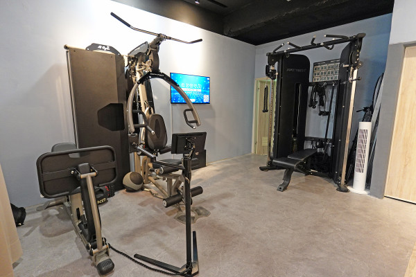 後面健身空間裡放了飛鳥多功能訓練機,可以做胸、肩、背各種動作,還有AI FIT智慧訓練設備。更酷的是,手機APP還能直接跟牆上的大螢幕串接,把訓練內容即時秀出,看得很清楚。