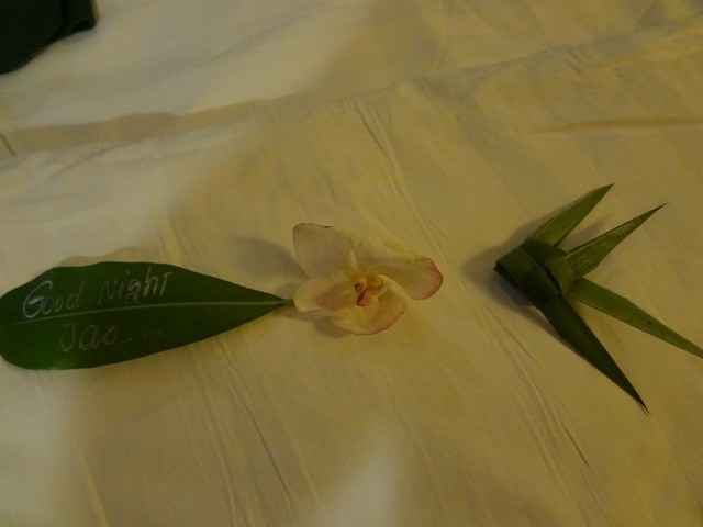 每晚都會擺上了小花和樹葉,還折了一隻魚!太窩心了~