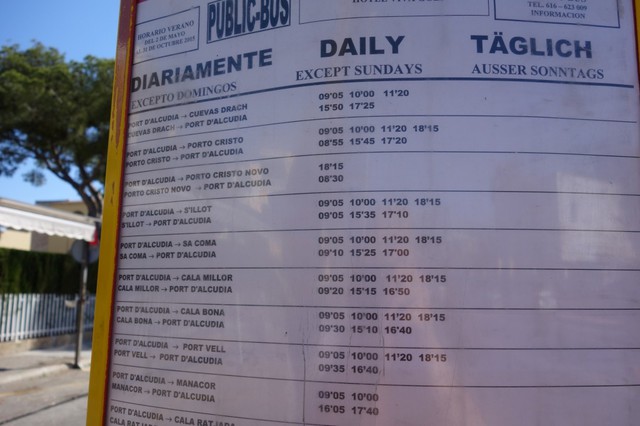 好險,好險!就在我們飯店門口的公車站牌上有貼著一張資訊,上面有班表,竟然可以從Port d'Alcudia海灘那兒(昨天去過,看遊記),有班次超少的公車可以到達Cuevas del Drach!!