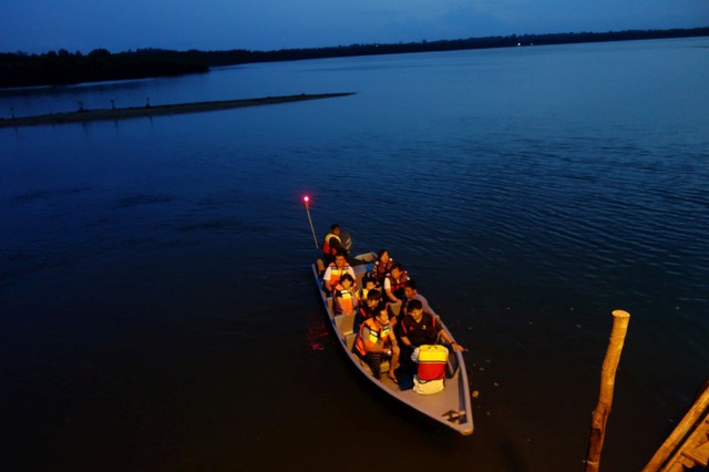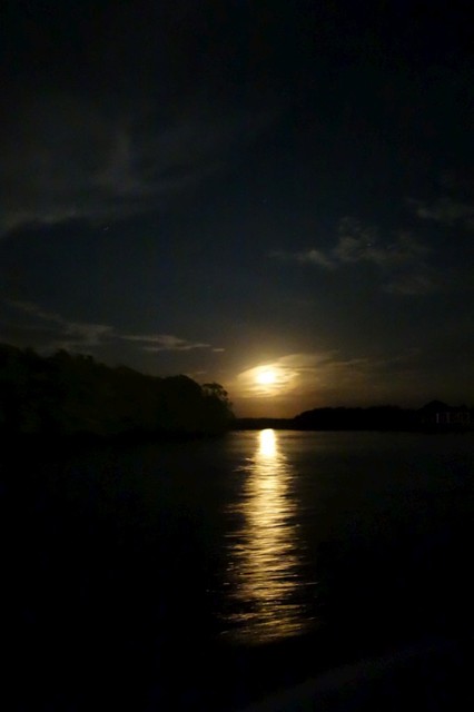 小船穿越了一片漆黑的紅樹林河,只剩下月光灑落在水面上~