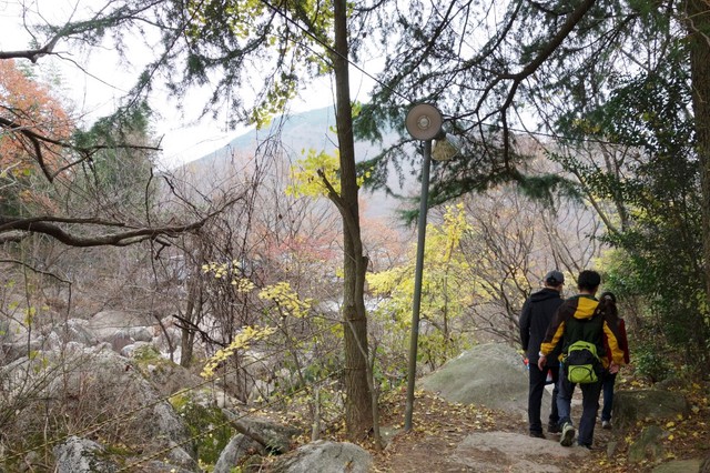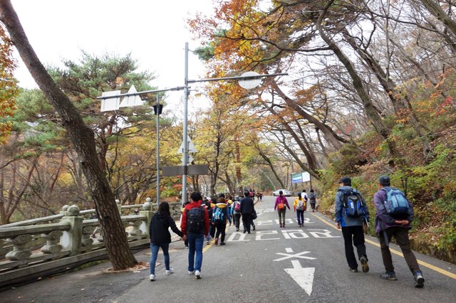 這條石頭路,會一路通往山上的金井山城(類似韓國萬里長城的概念),我們之所以會一直走,是因為總覺得在梵魚寺楓葉看得不太過癮,所以想說會不會往上走會有更漂亮的?