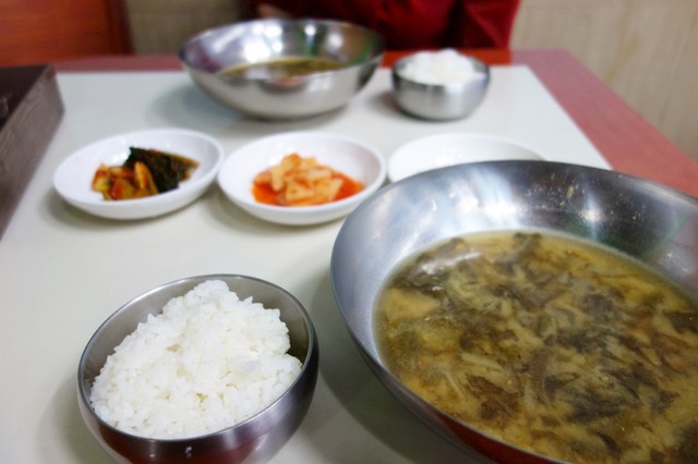 我們本來以為大醬湯,就是一般的味噌湯,但沒想到這裡點湯是附白飯和小菜的,所以老闆娘比手畫腳,跟我們說如果吃了這組大醬湯會吃不下飯捲,所以建議我們先吃完湯再決定要不要吃飯捲~(果真就吃不下啦)