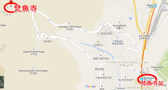 從梵魚寺站5號出口,走出來後往反方向走10公尺的第一個路口左彎,會是一個上坡路段,沿路有賣一些蔬果,大概走5分鐘,會看到一個公車匯集處,搭90號公車就會抵達梵魚寺了!記得在韓國搭車,可以先把目的地的韓文抄在紙上,給司機確認會更保險!