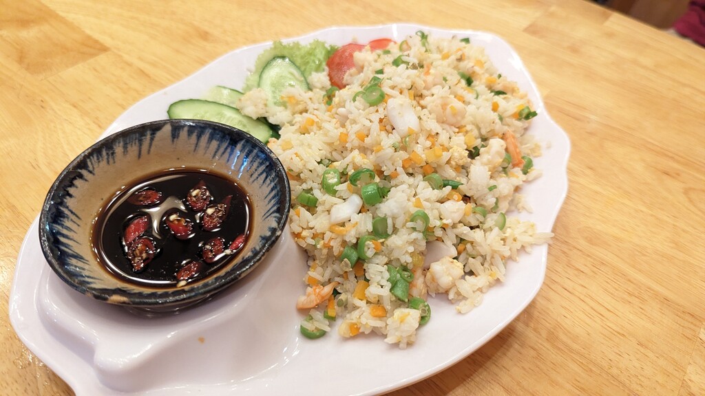 首先,峴港的海鮮炒飯有別於台灣的炒飯,光是用看的就覺得很不一樣,「很白」又「很乾」!裡面的配料有蝦仁、紅蘿蔔、炒蛋、碎豆子、花枝粒,旁邊佐以生菜、小黃瓜、番茄切片,感覺幾乎沒有加油或鹽巴,可是清淡爽口。一旁碟子裡放了辣椒與醬油,可以讓客人按照喜好的鹹度淋上炒飯拌來吃,瞬時就會增添醬油的焦鹹與甘味。(預訂峴港行程)