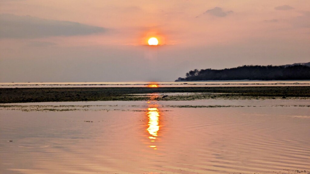 在Gili三島都是一樣,西邊到了傍晚就會退潮,珊瑚礁岩會露出,海灘不會像是早上那麼清澈、蔚藍。