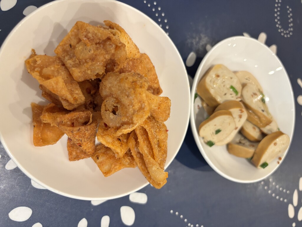 店家招待的小吃,炸酥皮跟涼拌素雞。