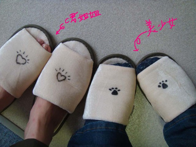 為了怕穿錯拖鞋,我們有了各自的家徽。我的是『熊出沒』。
