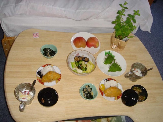 女大生營養早餐之二。豆皮壽司、飯團、醃漬醬菜也是女大生牌的,綠色的葉子是紫蘇,我好愛吃喔!