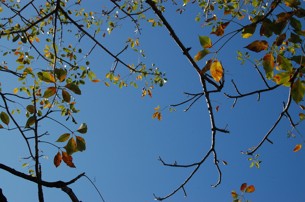 時節雖是冬日,但天氣暖和、陽光晴好,藍天透著亮麗。仰頭間,秋冬枝頭上色彩豐富的葉片們在逆光的鏡頭下顯得精神奕奕,彷彿穿著漂亮衣裳的俏姑娘吸引人目光,在等人的早晨且先將這份美好的景致留在心房。