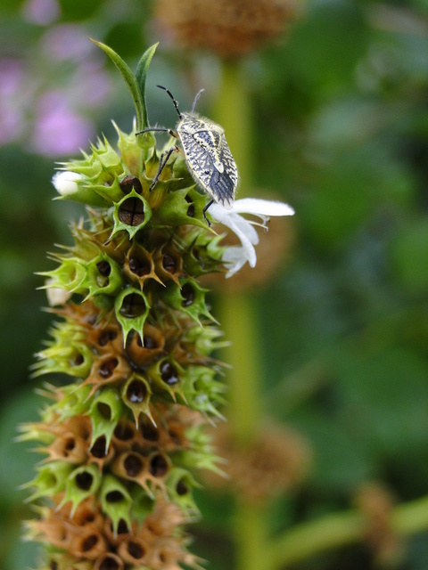輪繖花序,腋生,唇形花冠淡粉紅色或白色,雄蕊 4 枚,花萼鐘狀,花期夏季。