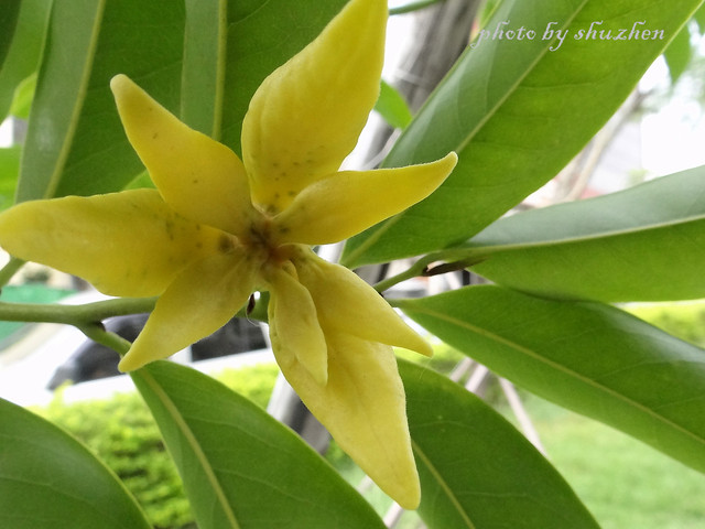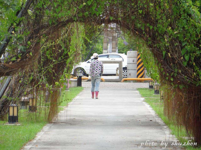 狹長形的公園架著幾處A字型的棚架,蔓藤植物攀爬而上,鷹爪花有花有果正成長。錦屏藤紅褐的藤鬚美如簾幔,被收攏在A字型棚架的兩旁。行在其中的來者如入畫中,欣賞這般此地獨有簡單素樸的美畫也是一樂。
