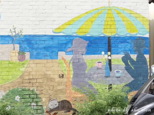 公園旁一家小店有美麗的庭園,這家店家的外牆幾年前遊走時我曾為它留下影像。那時紅磚砌的牆面透著典雅,卻在其上鑲掛著一幅簡潔咖啡店家的廣告,於是一個原本很古意的牆面彷彿被加入了強烈的元素一般,變得十分跳動,非常吸引我的視覺。如今牆上換上溫馨情境畫作,淡雅色彩與美麗畫境使人觀畫恬淡、怡然。今日這一方小天地陪我共渡半個午后時光,簡單素樸的美裡頭,有我滿心歡悅的欣賞。