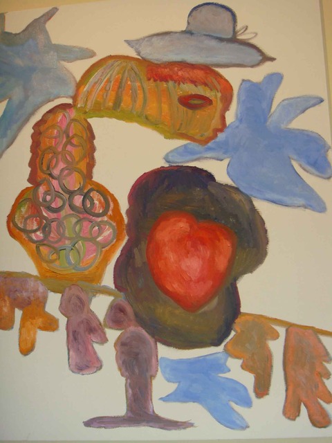 苦瓜寮作品:老師最近常叫我自己講解自己的作品,試圖說出自己在畫什麼?……這幅是一種感覺,斷裂的感覺,中間沈重的是心情,也是色彩的沈重,藍色的部份是對自由的渴望,渴望卸下重擔。也就是當人的內心有重擔壓著時,人會自己找出口,所以紅色的心有希望的感覺。我只是在探索,到底在探索什麼呢?還在不斷探索中,我的畫是一種探索的過程。