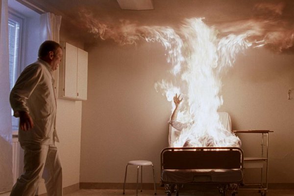 圖中燃燒的人是一個無辜的女配角維吉尼亞,她的丈夫因為好友被艾莉所殺而處於憂鬱與脆弱中,兩夫妻爭吵的一夜裡,獨自離開的維吉尼亞被艾莉攻擊,吸血鬼的獵殺是飲完血後必須殺死那人,否則便會變成吸血鬼。維吉尼亞便是那一夜沒死而變成吸血鬼的女人,她被貓糾纏,被送入醫院,她要醫生拉開清晨的百葉窗,陽光照了她全身,因此成了上圖的模樣......