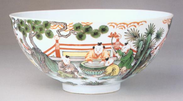 這件五彩瓷碗,是先用高溫燒製成白瓷之後,再用不同的顏料,以較低的不同溫度燒出不同顏色的圖案。如果其中沒有紅的顏色,便叫素三彩。圖案是一群男孩在有山石樹木的庭院中玩各種遊戲之景。在古代,孩童遊戲是普遍受歡迎的圖繪題材,清宮中就設有擅長嬰戲的畫工,待命繪製嬰戲圖作為賞賜臣下的物品。