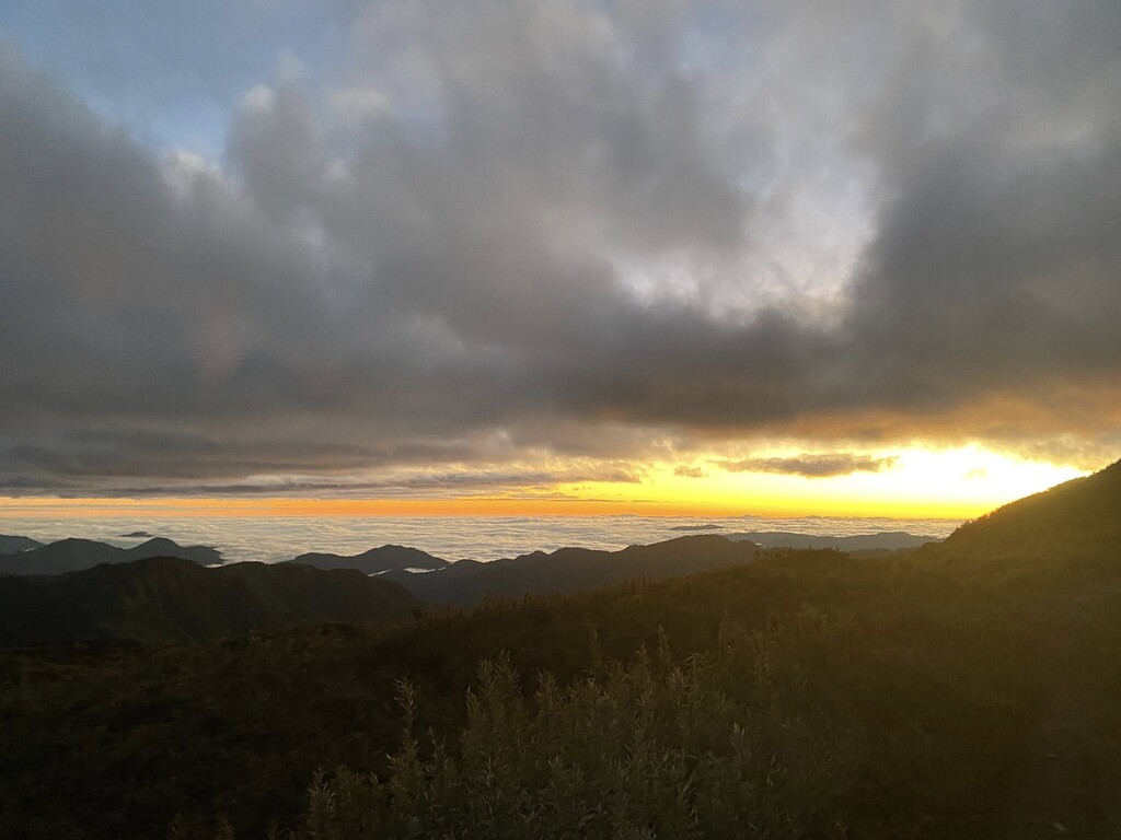 第一天我們騎腳踏車飛奔19九公里的大鹿林道,2個多小時就到登山口,好的開始,但屁股很痛。然後就是一路陡上4.1公里直到九九山莊,這次我叫寶哥走第一個,我壓後,就是怕簡大哥一開始走太快又不舒服,就這樣順順的走,下午3點左右就到了山屋,第一天挺順利的,不過上到高山食慾不佳,隨便吃一吃就準備睡覺了,第一晚一樣,翻來覆去,睡睡醒醒的,第二天凌晨3點起登,應該是沒睡好的關係,再加上頭燈只照著前面幾公尺,然後前面一段路都是走在樹林裡,心裡悶悶的,想著為什麼要這麼累得來爬山,腳酸、頭漲、心悶,就這樣走了兩個多小時,內心不斷地在交戰著,直到走上陵線,看到開闊的雲海,大小霸就在遠方促立著,我的心瞬間開闊,眼前的美景讓我驚嘆連連,所有負面情緒在那一刻都被拋到九霄雲外。