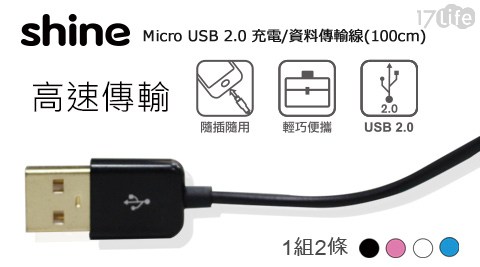 平均最低只要88元起(含運)即可享有【SHINE】Micro USB 2.0 充電/資料傳輸線(100cm):1組/2組(2條/組),顏色:黑/藍/粉/白(同組同色)?
