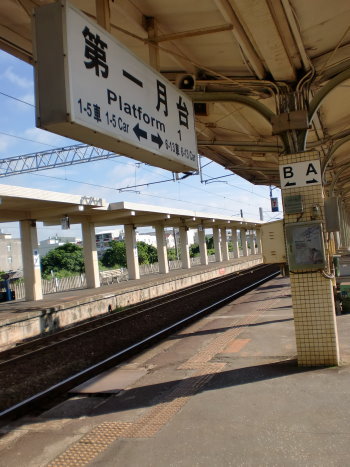 坐在月台的台階上 早晨的太陽露臉險的些許炎熱