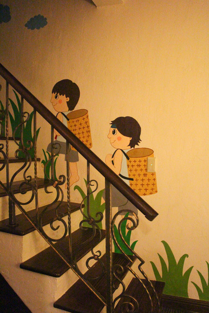 晚上時,記得點亮通往二樓小孩房階梯上的小夜燈,階梯旁的壁畫在夜燈照亮下,會產生一種很安詳的氣氛,讓人忘了一天玩下來的疲憊,快樂的進入夢鄉。 | |