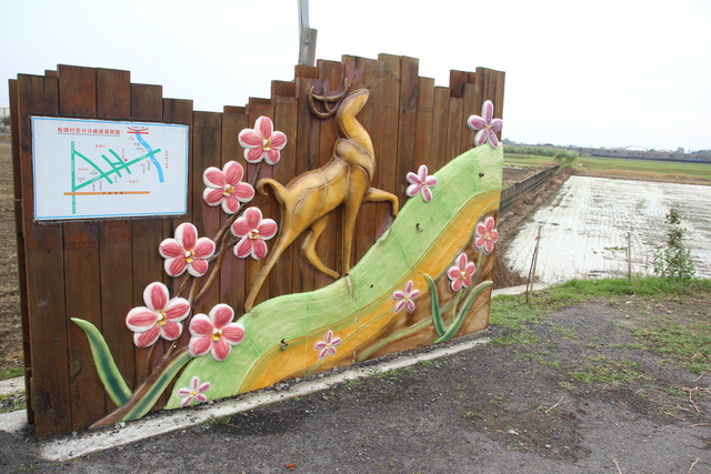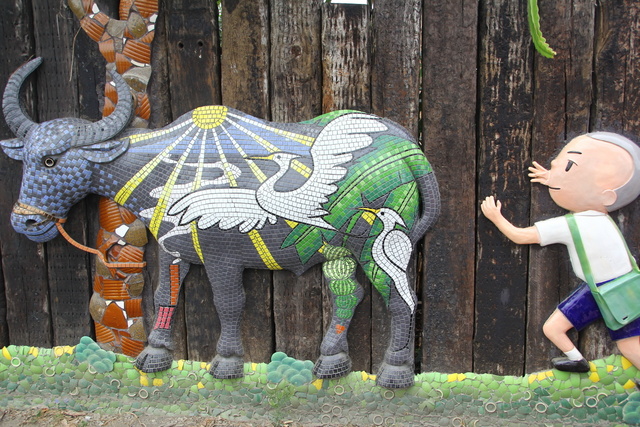 農路旁的鐵道上,以馬賽克拼貼藝術的台灣水牛,不但色彩斑爛,更能展現出台灣人吃苦耐勞的精神。 |