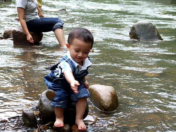 小 B 仔終於玩累了, 抱著奶瓶, 大刺刺地坐在導演椅上, 有夠萌的! ^_^ 基本上,這裡只要別太靠近河中央,都還蠻安全的。這條小溪流,水流平緩,水也不深,溪中魚蝦不少,是一個適合親子同遊玩水的好地方。 |
