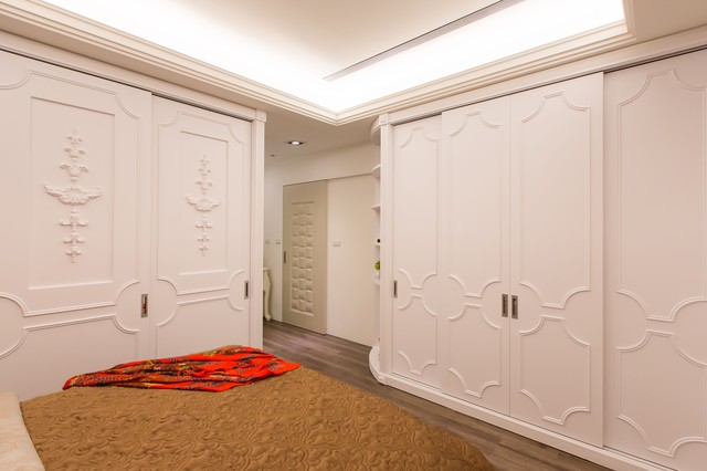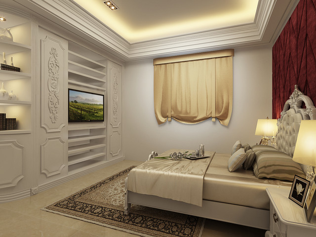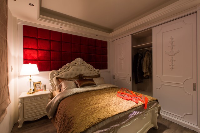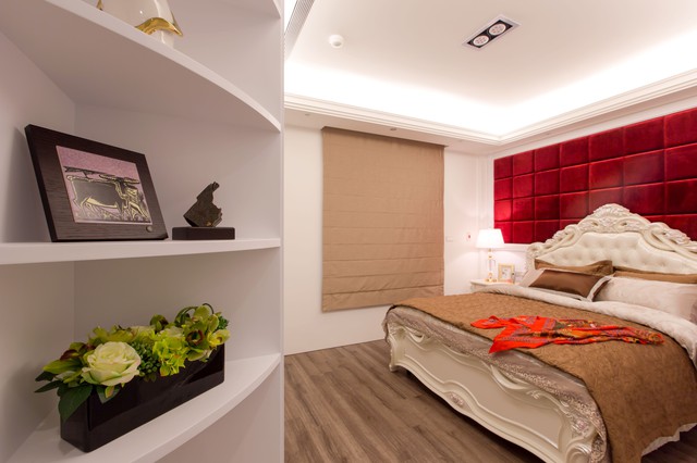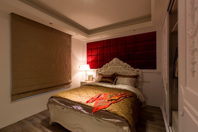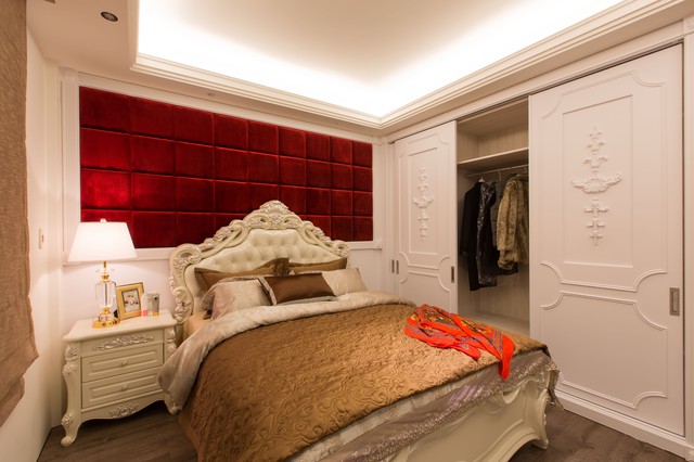 為了放大空間感,設計師以白色色系為主軸,床頭牆以紅色繃布表現,並善用古典風格中的對稱原則, 感覺更加搶眼! |