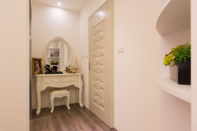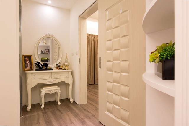 設計師巧妙地利用浴室門口的空間, 來放置梳妝台。 |