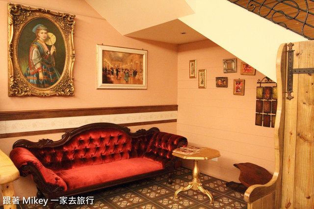 酒紅色的貴妃椅, 金色的茶几, 牆上還掛了幾幅西洋古典畫, 彷彿是豪宅裡的小角落。 |