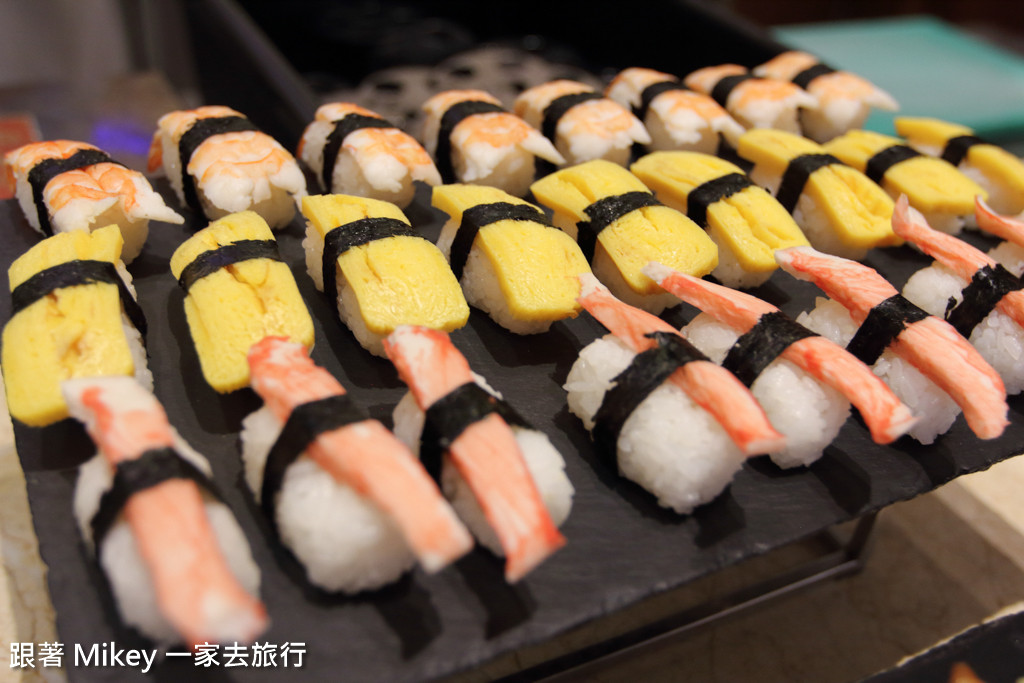 Mikey 的餐盤, 儘是壽司、淡菜和松阪猪。 不過如果想當大胃王的話, 最好不要吃太多有飽足感的壽司, 免得吃不下其他食物。 |