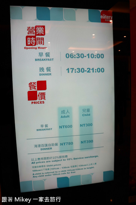 我們用餐的地方在 『 宜客樂 』, 因為飯店只附送兩客晚餐, 所以 B 仔和鴻鴻要另外付費, 價格都不便宜。 【 註 】 ● 一般成人收費標準 : NT$780 + 10% 服務費 / 每人。 ● 兒童收費標準 : 身高 100cm 以下免費,101-130cm 兒童半價,131cm 以上成人價。 |