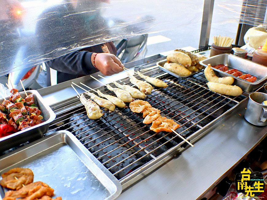 烤類食材大概就包含甜不辣、糯米腸、香腸、豬肉串、雞翅,沒有價目表,不清楚的可以自己問一下,其中甜不辣今天去買傍晚5點就完售了,應該是賣最好的品項
