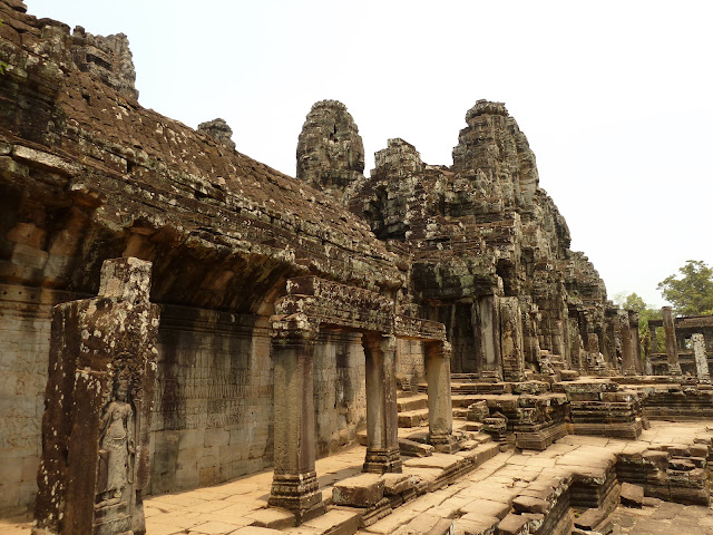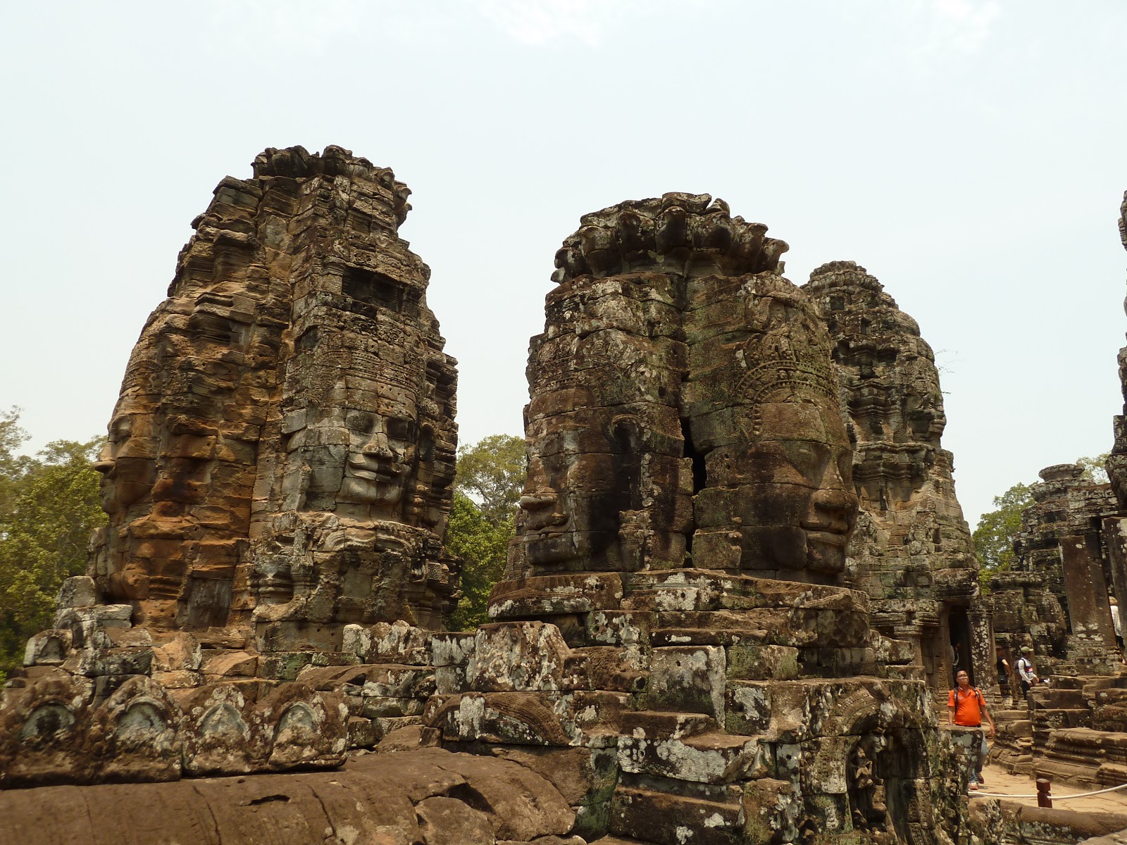 坐篤篤由南門進入大吳哥,參觀了巴戎寺(Bayon)。巴戎寺共有三十七座塔,每座塔均由巨石砌成,高低錯落,古跡斑駁,塔的四個方向均刻有一張臉,每張臉都栩栩如生,微笑着注視大地,你走到哪裡都像被他們看着一樣,這就是著名的「高棉的微笑」。
