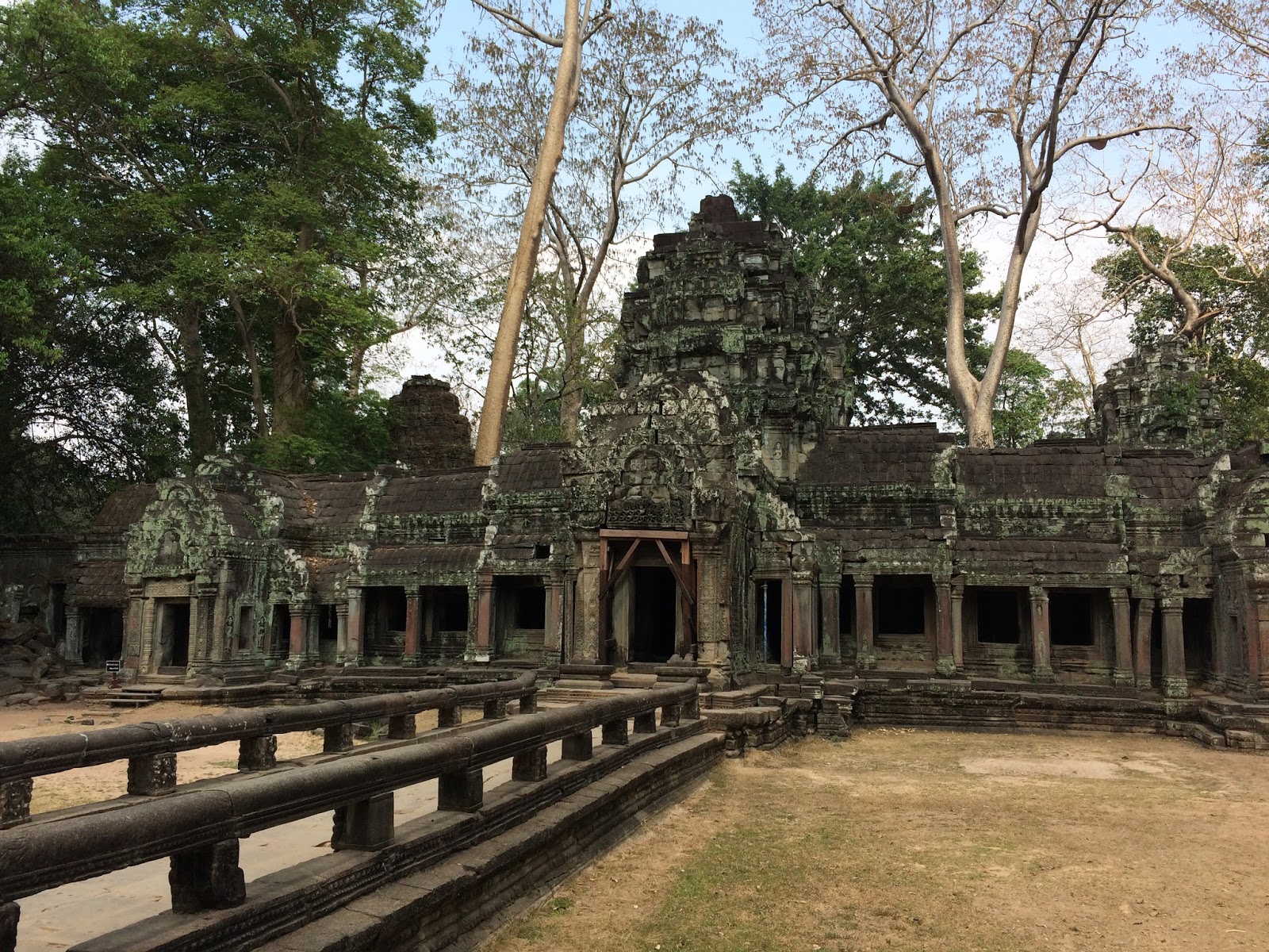 從勝利之門(Victory Gate)出去,約略參觀了兩個小廟托瑪儂神廟(Tommanon)和周薩神廟(Chao Say Tevoda),到達茶膠寺(Ta Keo),一塊牌子上寫着的中文字映入眼簾:「中國政府援助柬埔寨吳哥古跡保護(二期)茶膠寺保護修復工程」,舉頭一望,只見一條吊臂正在運轉,中國施工隊的修復工作正在進行。(第一期的援助項目就是那周薩神廟)