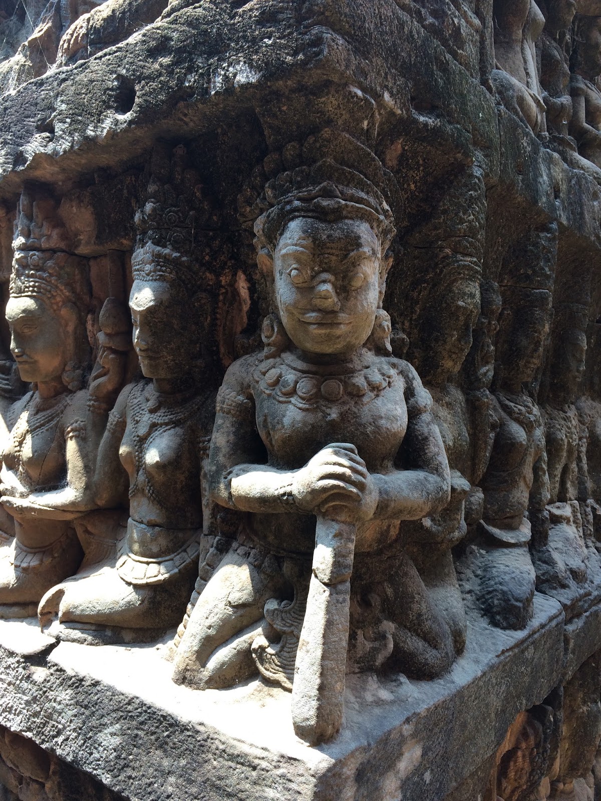 由戰象平台往北一直走到癩王平台(Terrace of Leper King),浮雕更是栩栩如生。前護牆有七層雕刻,底層為九頭蛇神那加(Naga),其上無數的仙女阿帕莎拉(Apsara),令人目不暇給。