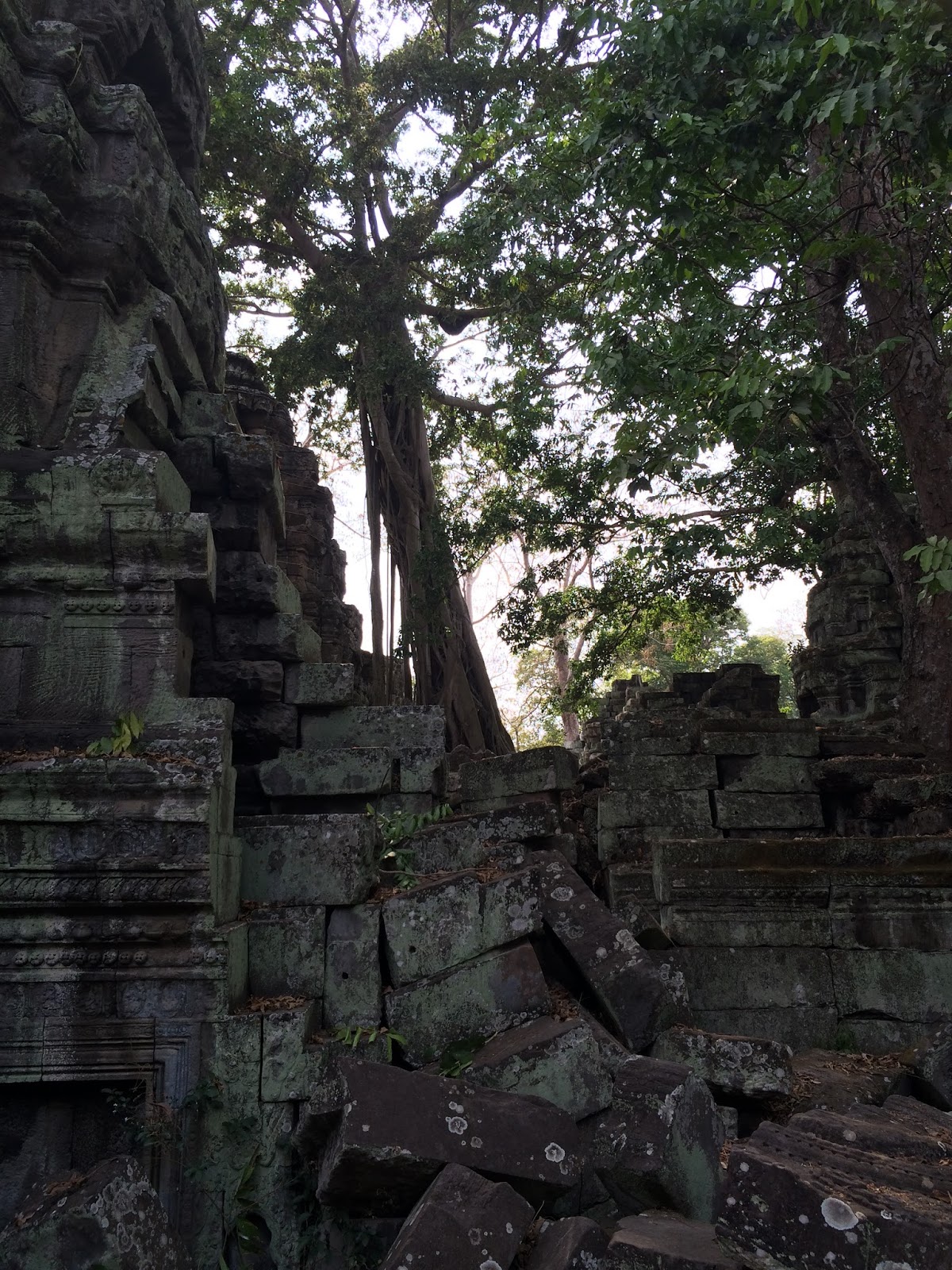 那些巨大無比的樹是吉貝木棉和四數木,幾百年前,牠們的種籽也許被風吹,也許來自鳥的糞便,落在已經荒廢的寺院的石縫中,經歷數百年雨露滋潤和陽光給養,慢慢生長擴張,一邊將建築物推倒,一邊又將建築物包裹,樹的下端看起來就像溶液一樣,穿透人類難以徒手憾動的石塔與廊壁;