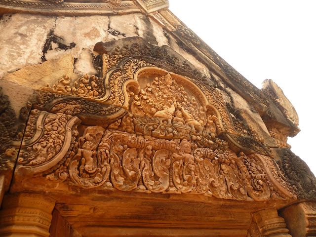 離開崩密列,啟程前往女王宮(Banteay Srei),又是一次屁股受罪的行程,差不多坐了一個鐘頭篤篤,才去到目的地附近的餐廳,祭過五臟廟再說。 下午時分,陽光猛烈,近四十度的高溫,人都溶化了。終於去到女王宮,一片粉紅色映入眼簾,建築群規模竟如此之細小,也不似塔布籠寺和崩密列般被樹木佔據,這地方到底有甚麼本領被認為是非來不可呢?走近一看,一幅幅細膩、生動、傳神、美侖美奐的浮雕像活生生一樣出現在眼前,我就知道這地方值得一游,甚至再游了。