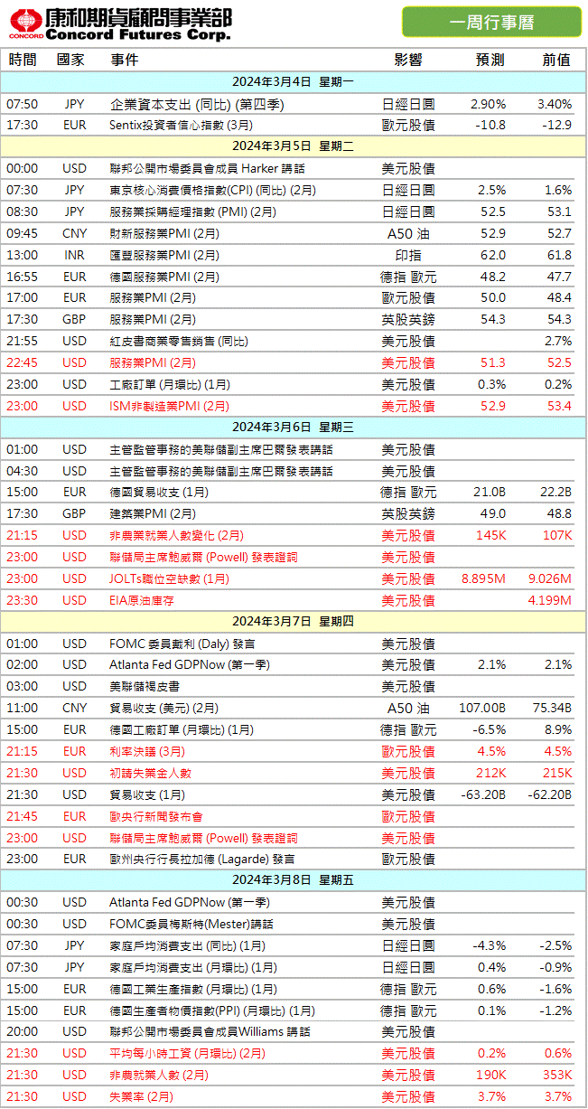 康和期貨-重要數據行事曆20240304@康和期貨國內外期貨選擇權優惠徐雅如#外期海期期貨手續費