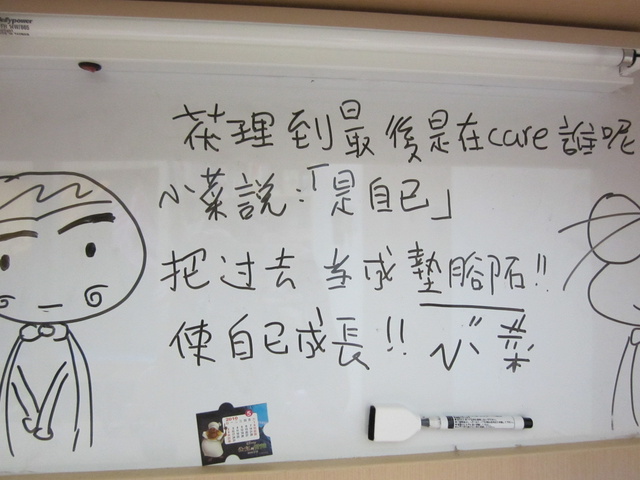 (Pic:這是我們家的空床白板,小菜的塗鴉天地,省略字很醜不講,這段話挺有涵義的:P,我在墊腳石下註記是小菜,結果小菜說,她是我的絆腳石,讓我不能得第一名這樣,這人好欠打!!!)