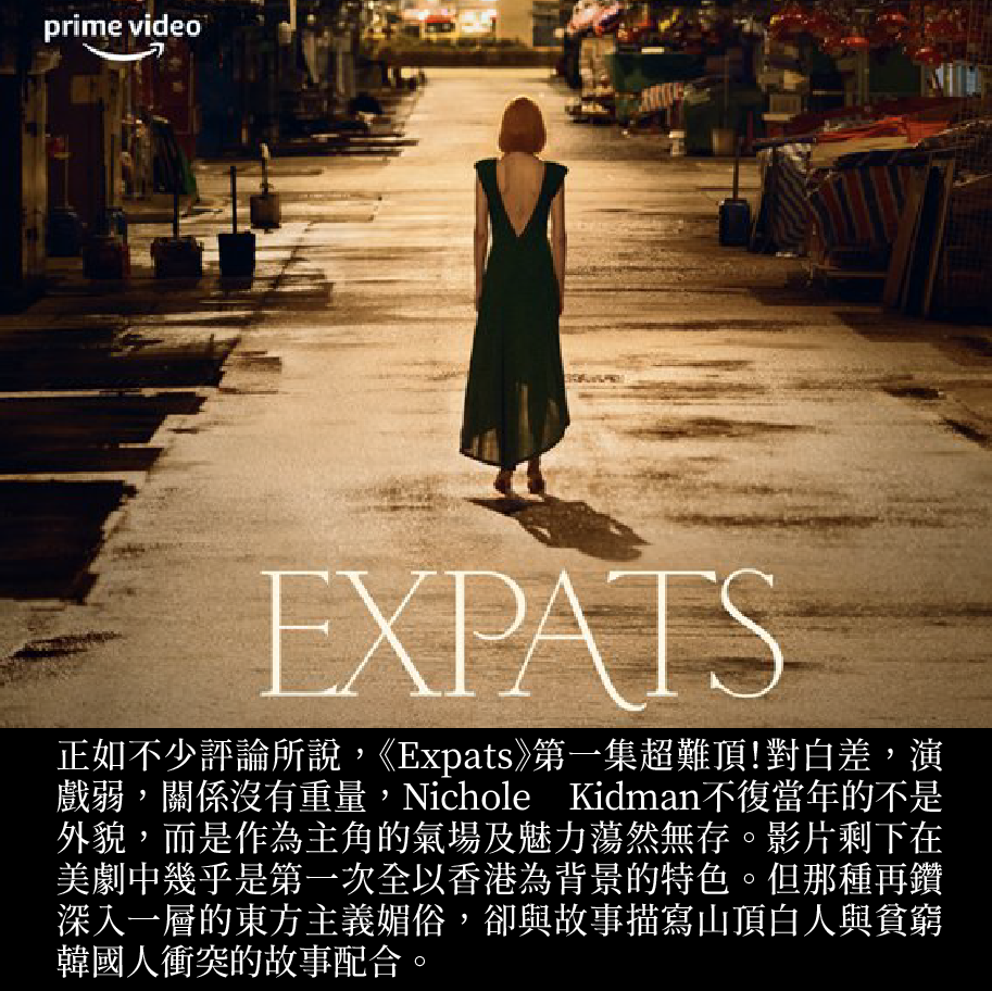 正如不少評論所說,《Expats》第一集超難頂!對白差,演戲弱,關係沒有重量,Nicole Kidman不復當年的不是外貌,而是作為主角的氣場及魅力蕩然無存。影片剩下在美劇中幾乎是第一次全以香港為背景的特色。但那種再鑽深入一層的東方主義媚俗,卻與故事描寫山頂白人與貧窮韓國人衝突的故事配合。