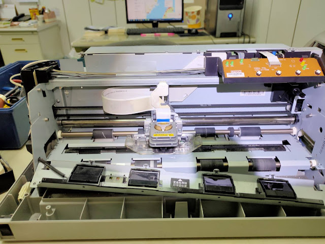 與客戶電話聯繫後,希望能到府維修,因為貼紙黏在感應器上,造成無法使用印表機,整台拆開後區下貼紙,字車座移動時稍微不順,發現軸承上很乾澀,做清潔加保養內部,最後做列印測試客戶看了沒問題交差。
