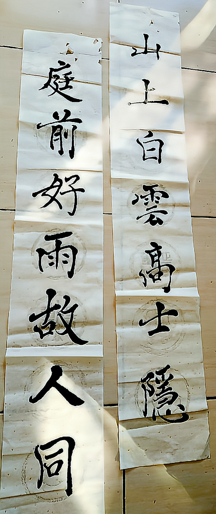 < 聯句解釋> 庭前好雨故人同 ,意思是庭前遇著一場好雨,與好友共伴欣賞 ~