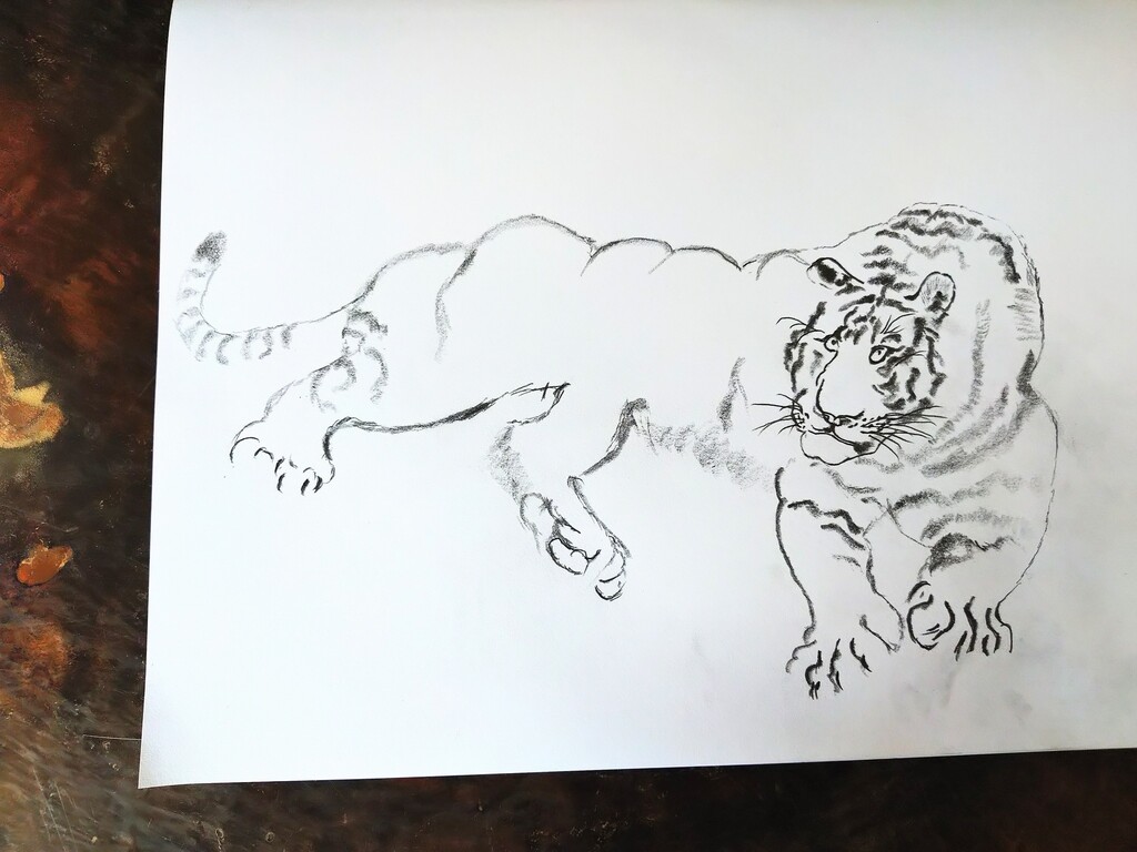 禮拜四有空閒時間 , 拿來其中的一幅虎畫臨摹 ,我先用鉛筆非常非常專注的臨摹、臨摹