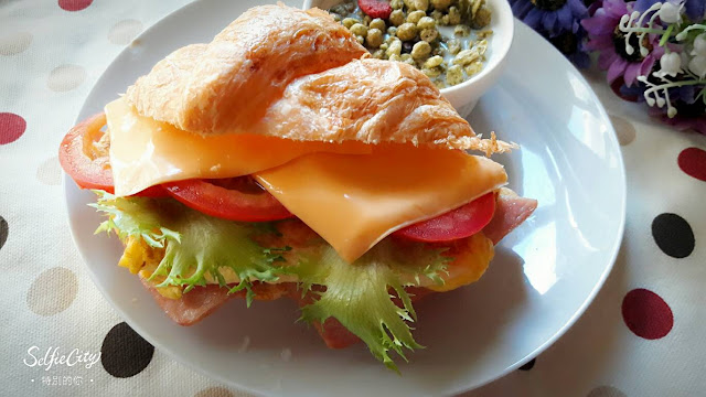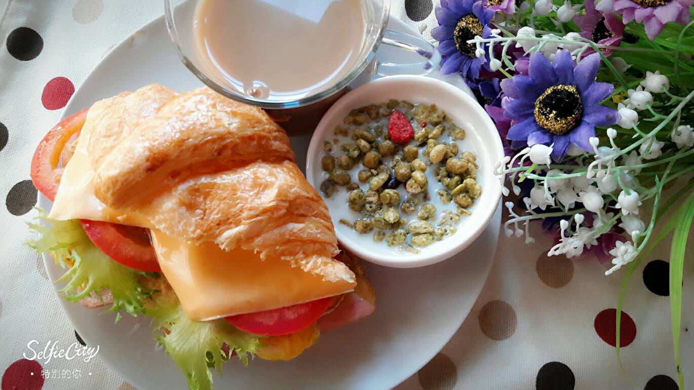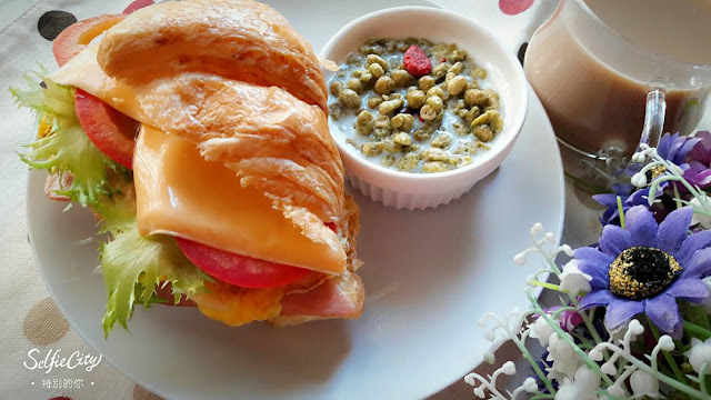 可頌早餐 ~ 火腿起司蛋可頌 + 抹茶穀物牛奶 + 香濃奶茶