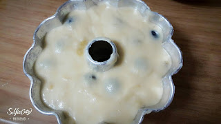 8. 倒入蛋糕模中 , 輕輕敲幾下桌子 , 把麵糊裡的氣泡敲出