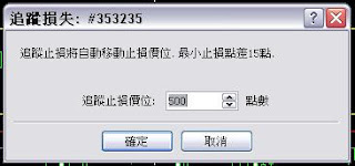 在終端視窗點選一單後,直接按滑鼠右鍵即會出現一對話窗,移動箭頭至「追蹤止損」,隨即會跳出點數設定視窗,移動箭頭至「自定義」選項後按左鍵,即跳出新的「自設點數視窗」。